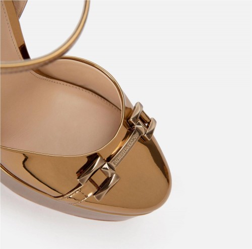 Platform sandal in metallic fabric. It features an upper in mirrored patent leather and a golden metal logo horsebit