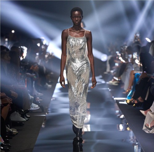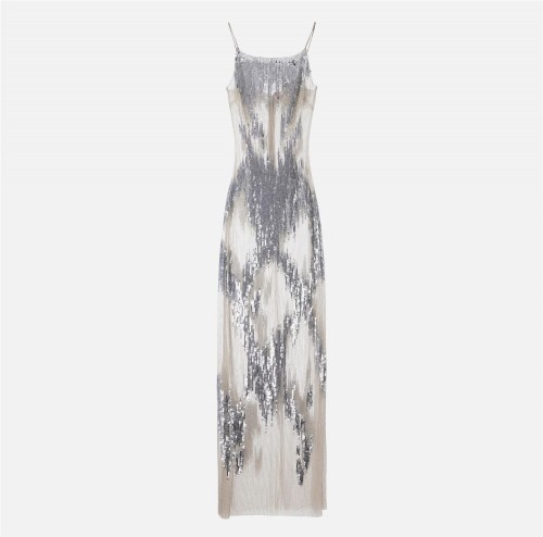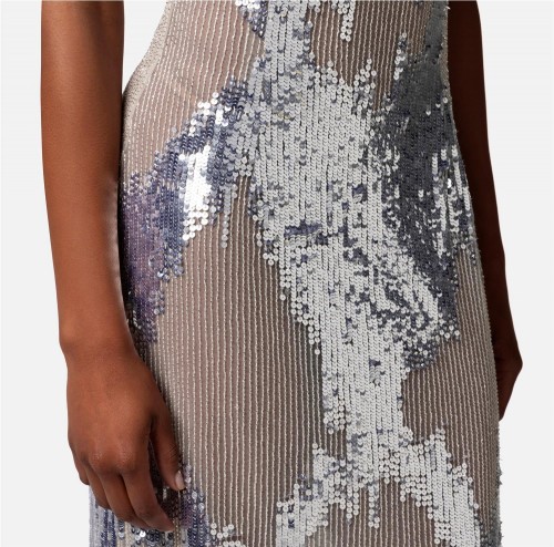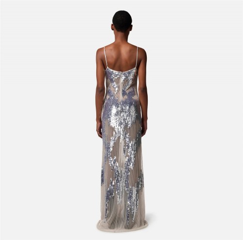 Vestido Red Carpet de tul bordado con lentejuelas y canutillos que crean un diseño lleno/vacío.