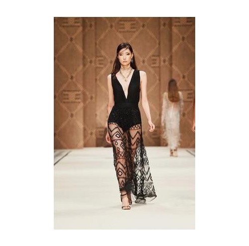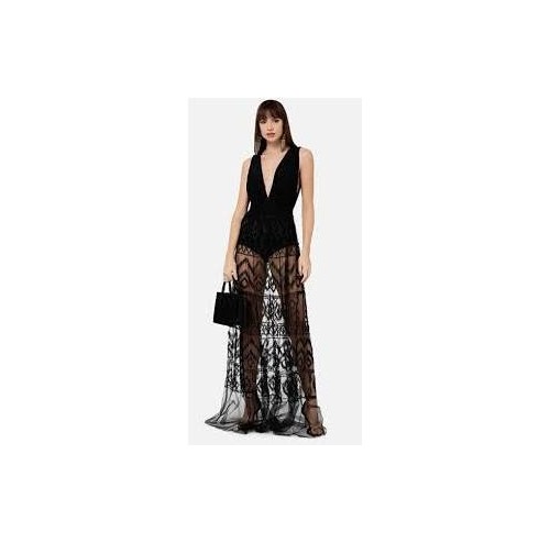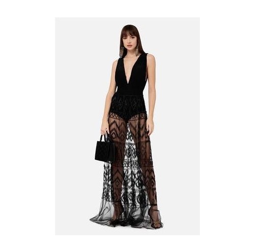 Vestido largo, de punto lurex, con cuello pico y falda evasé íntegramente bordado sobre una base de tul.