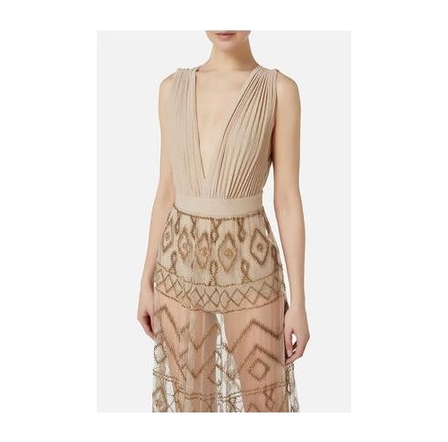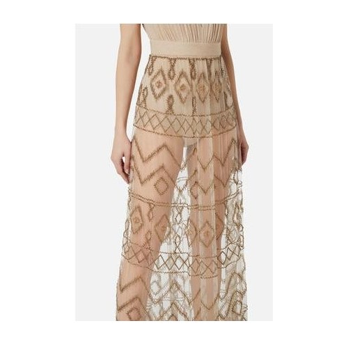 Vestido largo, de punto lurex, con cuello pico y falda evasé íntegramente bordado sobre una base de tul.